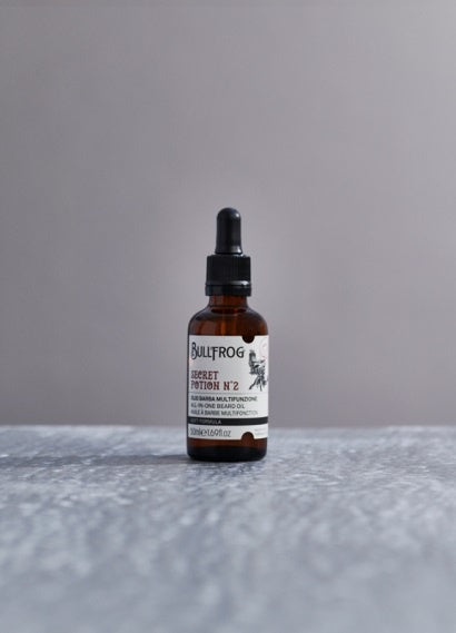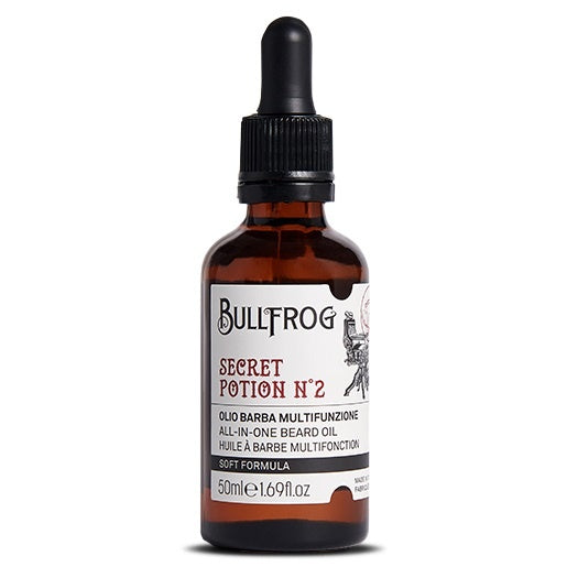 The Secret Potion N.2 All-in-One Beard Oil It is the irreplaceable secret formula by Bullfrog barbers, ideal for achieving flawless shaves and for nourishing every kind of beard, thanks to its soft texture. A multifunctional oil that can be used both as a pre-shave treatment and as a finish to make your beard soft and smooth. A soft formula, with a drier texture, that combines prickly pear extract, sunflower oil, jojoba oil, rosemary extract and wheat germ oil, to recreate a rich but light composition.