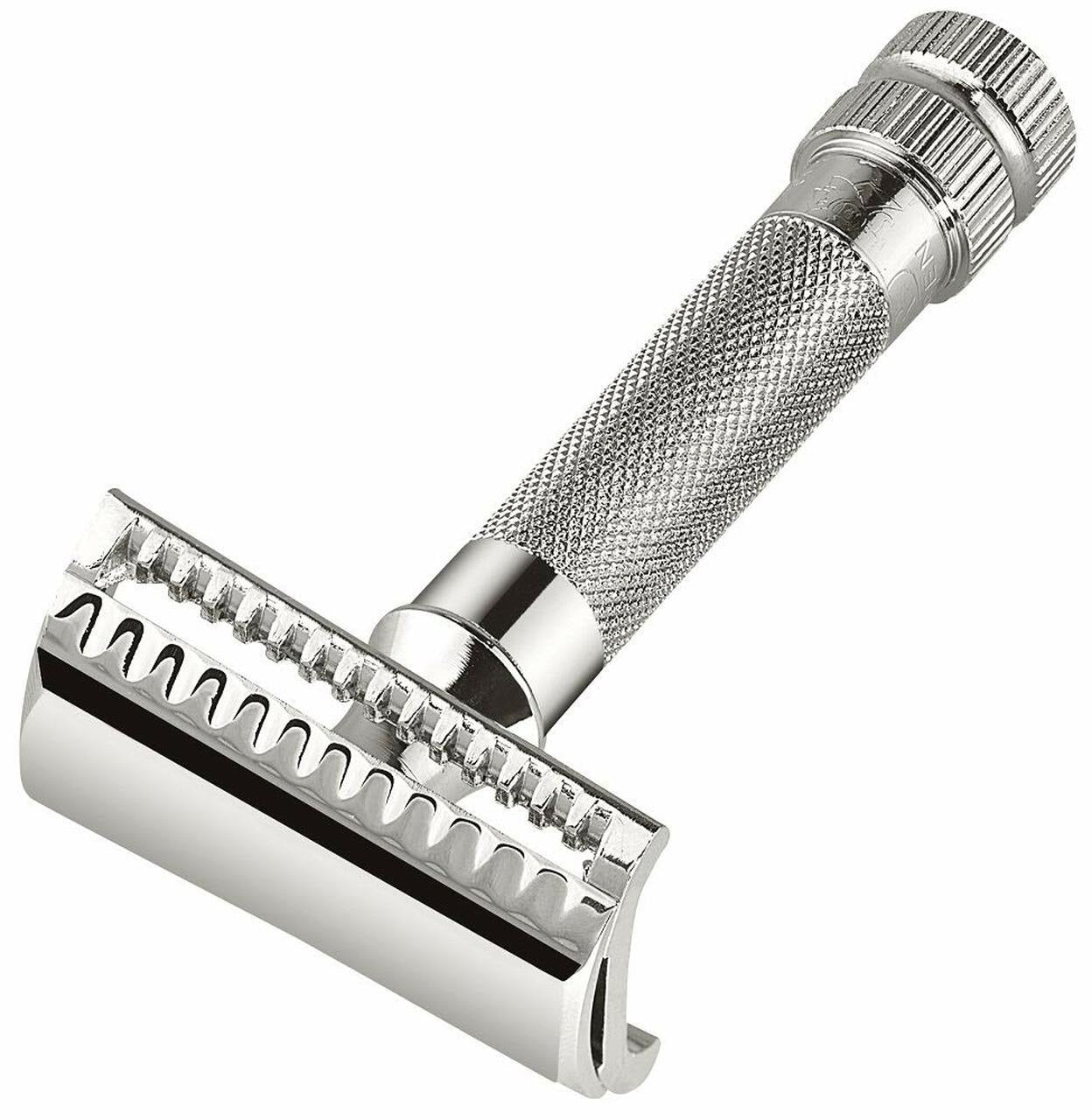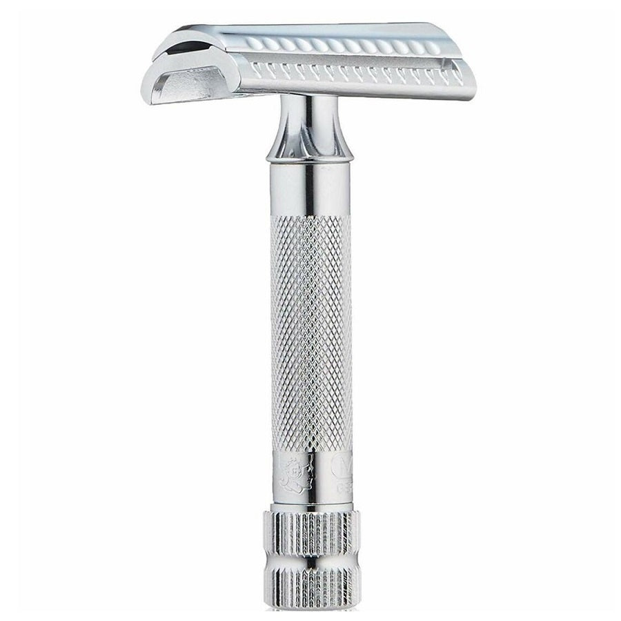 Merkur 2-Piece double-edge safety razor, with an elegant chrome finish, slant-bar head and heavy weighted (3”) knurled handle for fine control. Also known as the 37C, it is compatible with all double-edge blades.