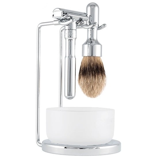 This beautiful set comes with everything you need to begin wet shaving. In addition to the MERKUR FUTUR in a stylish chrome design and its perfectly paired razor blades, you also get a shaving brush made of genuine silvertip badger hair. Effortlessly whip a luxurious shaving lather in the enclosed crucible. After you’ve enjoyed your first sensuous shave, you’ll understand why MERKUR is a favourite amongst clients who want to enjoy the highest quality home shave. Easily store your tools neatly on the stylish stand.