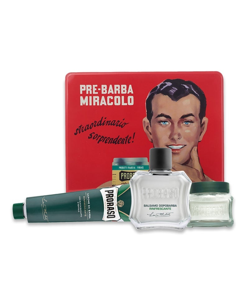 Including the three essentials for the classic Proraso shave at home, all in the green/refreshing and toning formula, with eucalyptus and menthol, for all skin and beard types.