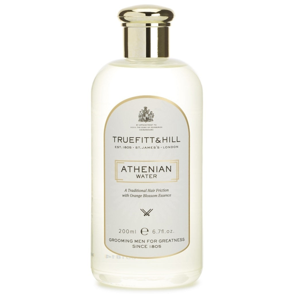Athenian Water is a traditional friction for fine hair. It has a light and zesty orange blossom essence which has strengthening and stimulating properties and is designed to promote scalp health whilst providing a light hold. It can be used in conjunction with any other of our hair styling products. Apply a few drops into dry or damp hair and massage vigorously into the scalp. Style as usual.