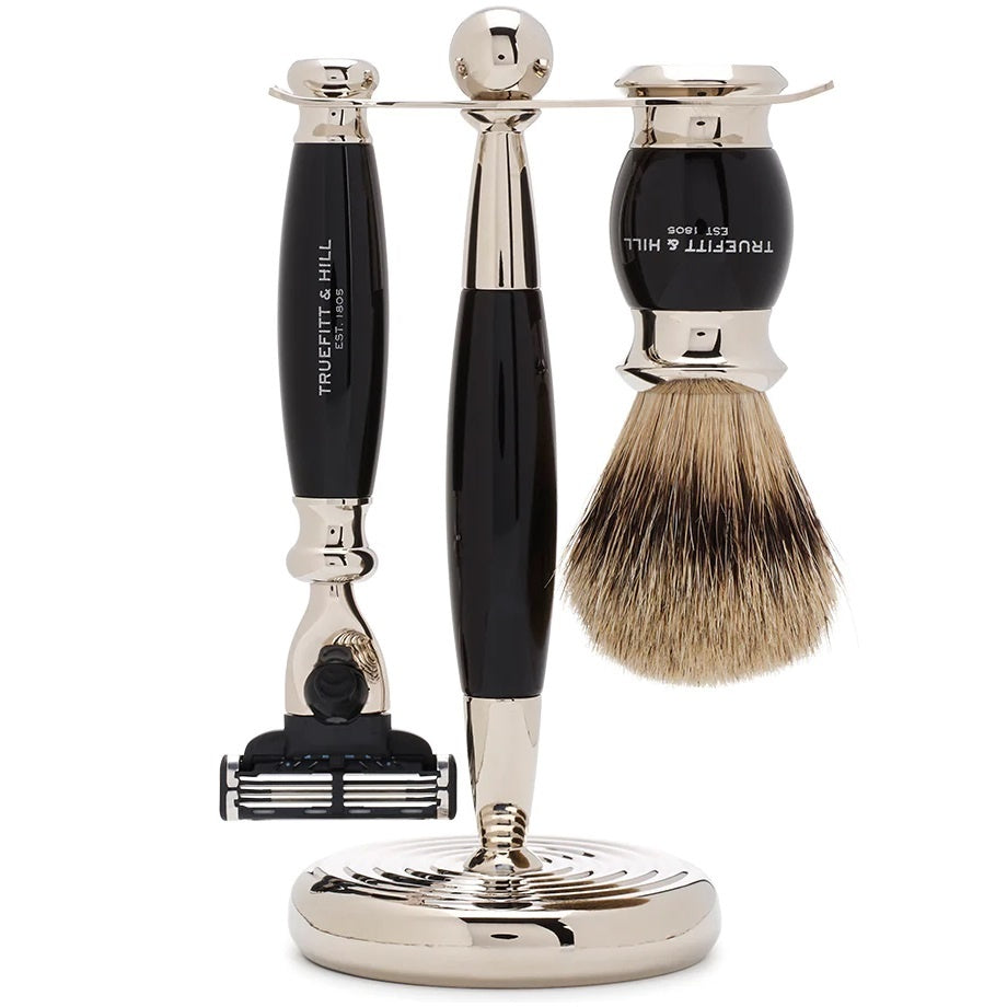 Truefitt & Hill’s traditional shaving set comprising a perfectly balanced razor, matching handmade super badger shaving brush and elegant chrome finish stand. Beautifully finished by hand.