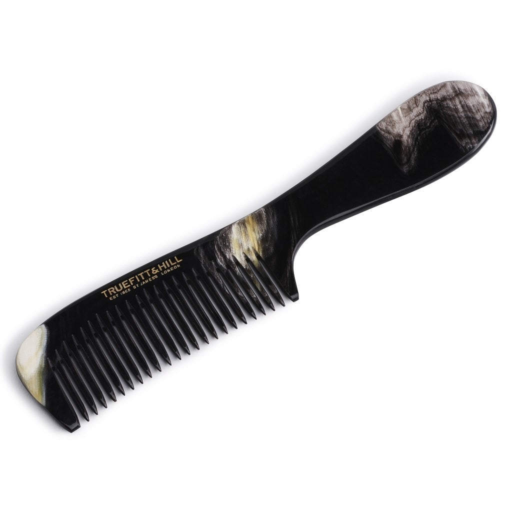Made in the UK and available in ethically-sourced natural horn. Each comb is unique thanks to the natural colour and tone variation present in each horn. Emblazoned with the Truefitt & Hill logo. Product length 194mm.